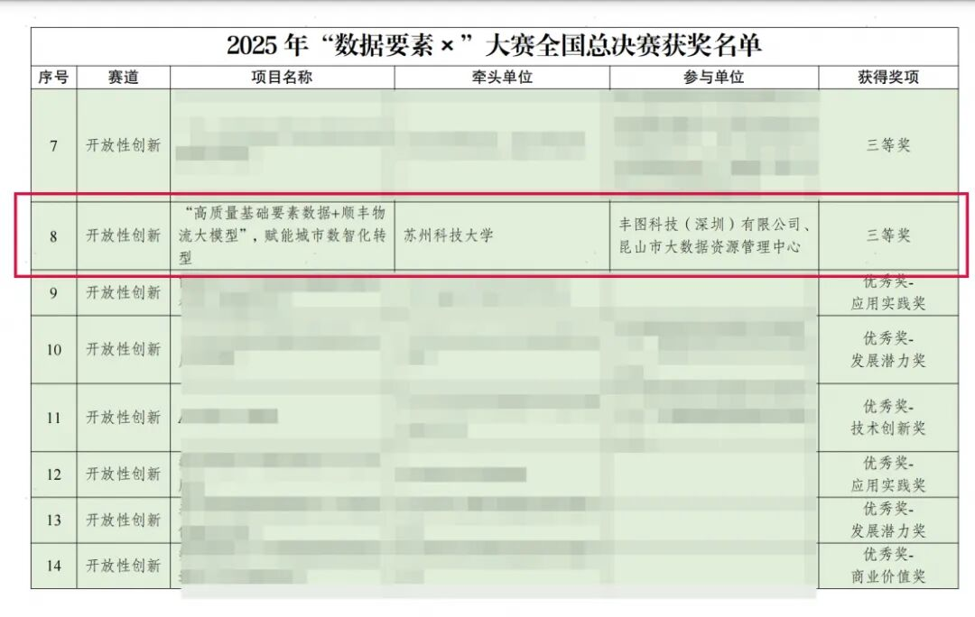 近日,国家数据局公布2025年“数据要素×”大赛全国总决赛获奖项目名单,苏州科技大学奚雪峰教授团队联合昆山市大数据资源管理中心、丰图科技有限公司(顺丰集团子公司)组建的「昆翼图联战队」,凭借《“高质量基础要素数据+顺丰物流大模型”,赋能城市数智化转型》项目,在开放性创新赛道中脱颖而出,斩获全国三等奖,标志着我校基于校政企产教融合模式开展的“AI+应用”创新实践得到国家级认可。